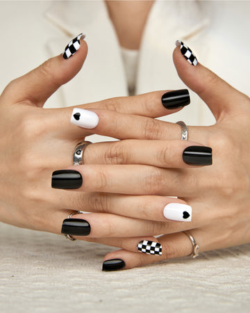 Heart-ache features short square press-on nails in a black and white checkerboard design, made to reflect your highs, lows, and everything in between.