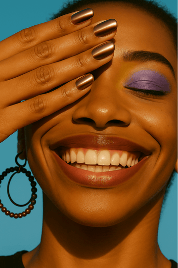 Bold bronze metallic press-on nails in a short square shape. Pre-glued for effortless wear and secured with SparkLock hold that lasts up to 7 days.