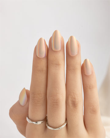 Pearlescent press-on nails with a mirror finish in a short almond shape. Pre-glued for easy application and secured with SparkLock hold that lasts up to 7 days.