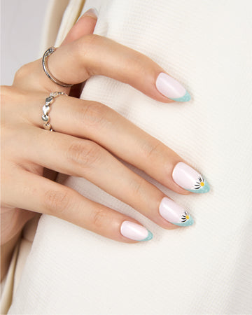 Hope in the Air features pre-glued short almond nails with a radiant daisy French tip and brushstroke design. Reusable, easy to apply, and damage-free—these press-ons bring instant optimism to your fingertips.