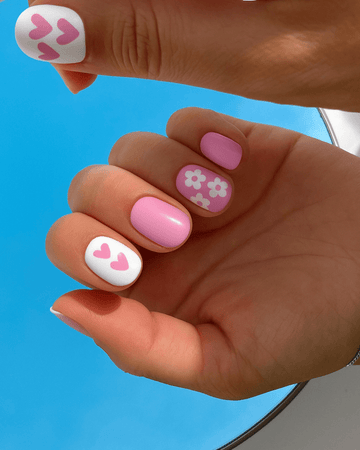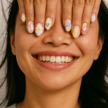 Playful floral press-on nails in a short oval shape with pastel colors. Pre-glued for mess-free application and long-lasting SparkLock hold up to 7 days.