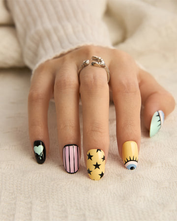 Feel it all with Panic. These short oval nails come pre-glued and ready to express your inner storm with abstract patterns that mirror your emotional world. Because even panic deserves a place to shine.